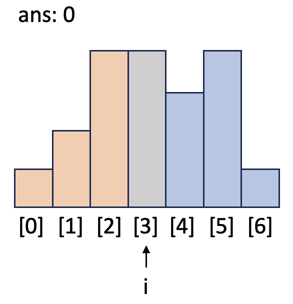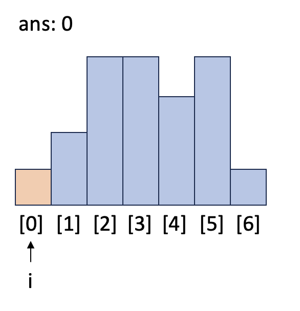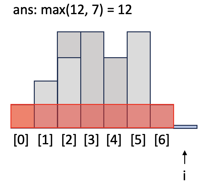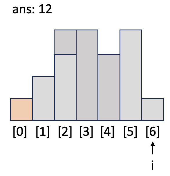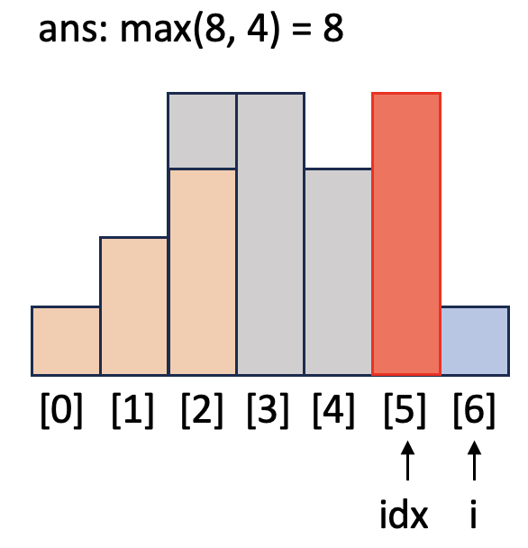 i = 6일 때 while 문을 돌며 `h`보다 작거나 같은 막대가 나올 때까지 넓이를 계산합니다. `idx`가 1이 되어서야 `h`와 같은 높이가 막대([0])를 발견하고 while문이 종료됩니다. `top`인 [0]과 `h`의 높이가 같으므로 `h`는 버립니다.