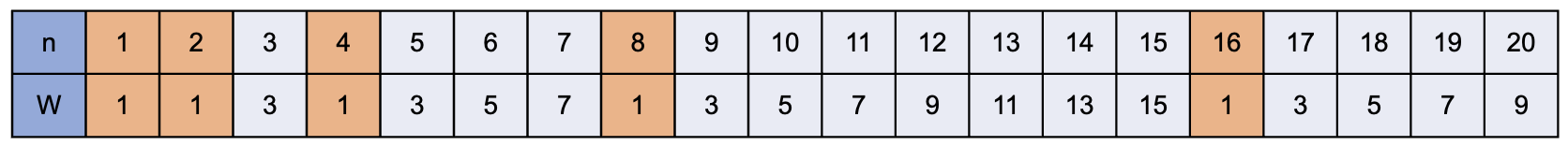 규칙이 보이시나요? 우선 $W(n)$의 값은 모두 홀수 입니다. 그리고 어떤 주기를 가지고 1부터 커지는 것을 반복하죠. 1만 표시해서 주기를 파악해 봅시다.