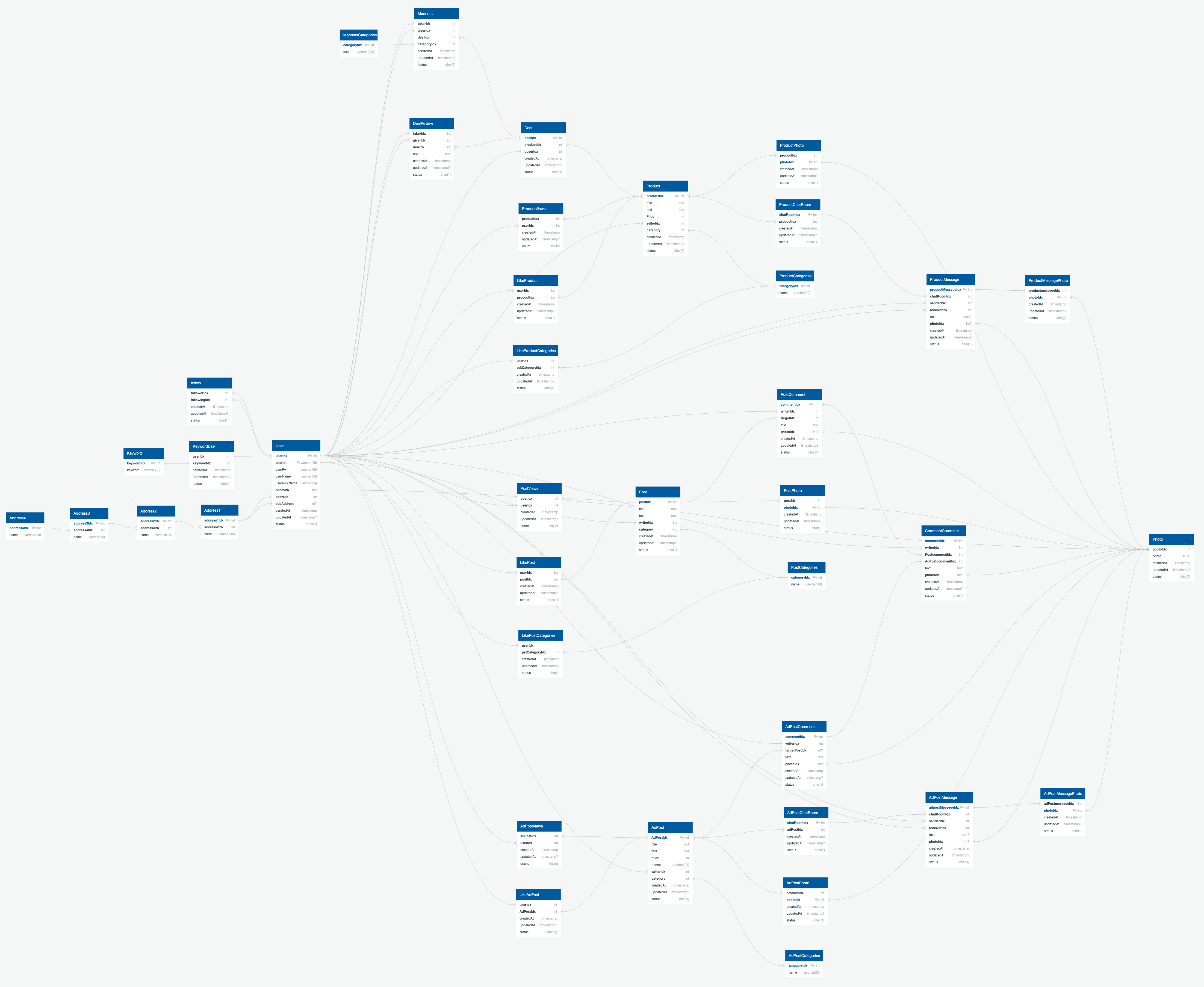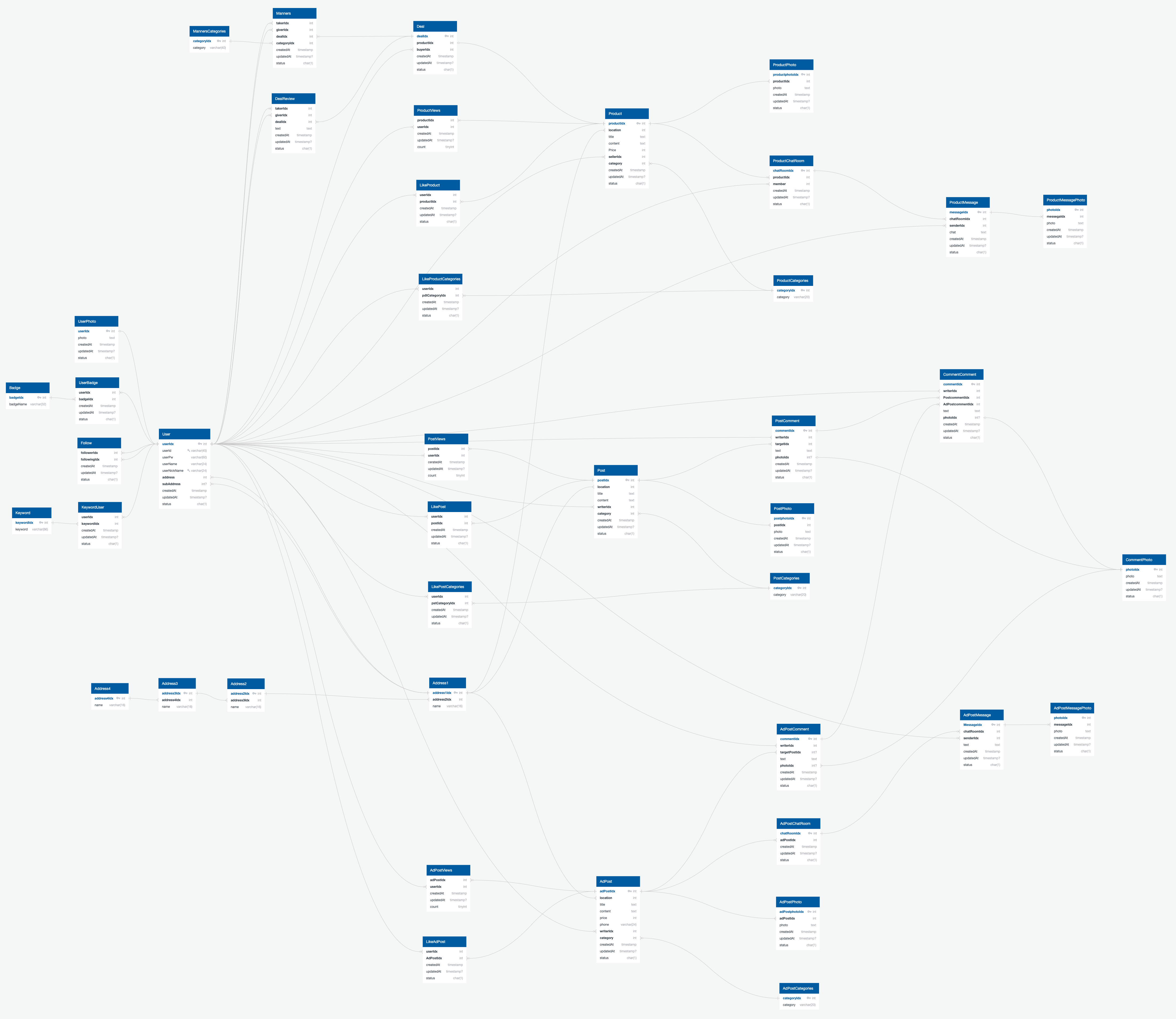 원래는 User 에만 연결되어있던 Address1을 Product, Post, AdPost에 모두 연결해줬다. 이유는 Product로 예를 들면 내 지역주변의 Product를 검색하려면 Product와 연결된 Address1이 필요하다. 처음에는 Product의 판매자의 주소를 가져올 생각으로 주소컬럼을 따로 만들지 않았다. 하지만 판매자의 주소는 address와 subAddress로 최대 두개다. Product의 판매지역을 가져올때 User의 address컬럼의 값을 가져와야 하는지 subAddress값을 가져와야 하는지 알 수없다. 그래서 각각 테이블에 location컬럼을 만들어 Address1테이블과 연결해줬다.