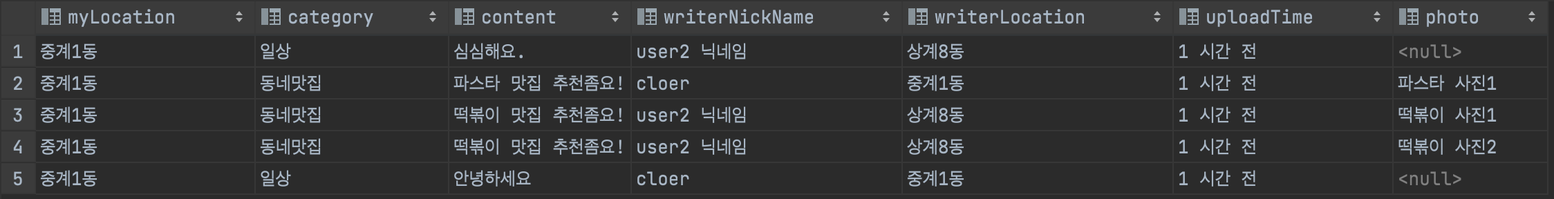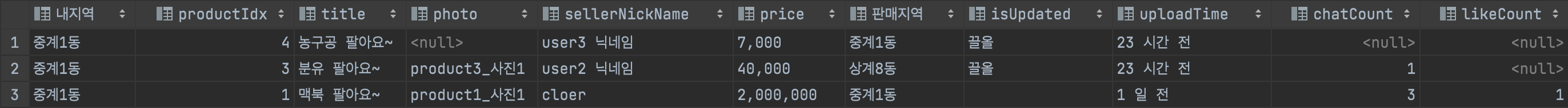 userIdx가 1인 사용자의 address2지역 내에서 올라온 글들을 반영 했다. 주소를 Address1부터 Address4까지 나눠 따로 저장한 이유가 이것이었다. 범위를 넓혀가며 검색이 가능하다. 따라서 내 지역은 중계1동 이지만 같은 노원구 안에 있는 상계8동에서 올린 상품을 조회 할 수 있다. 검색 지역을 확대고 싶다면 Address2 테이블을 join 해 address3Idx를 사용하면된다. 실제 당근마켓에서는 구나 시같은 행정구역단위로 범위를 규정하지 않는다. 마다 GIS를 이용해 행정구역이 아닌 실제 지리적 정보를 이용할 것이다.