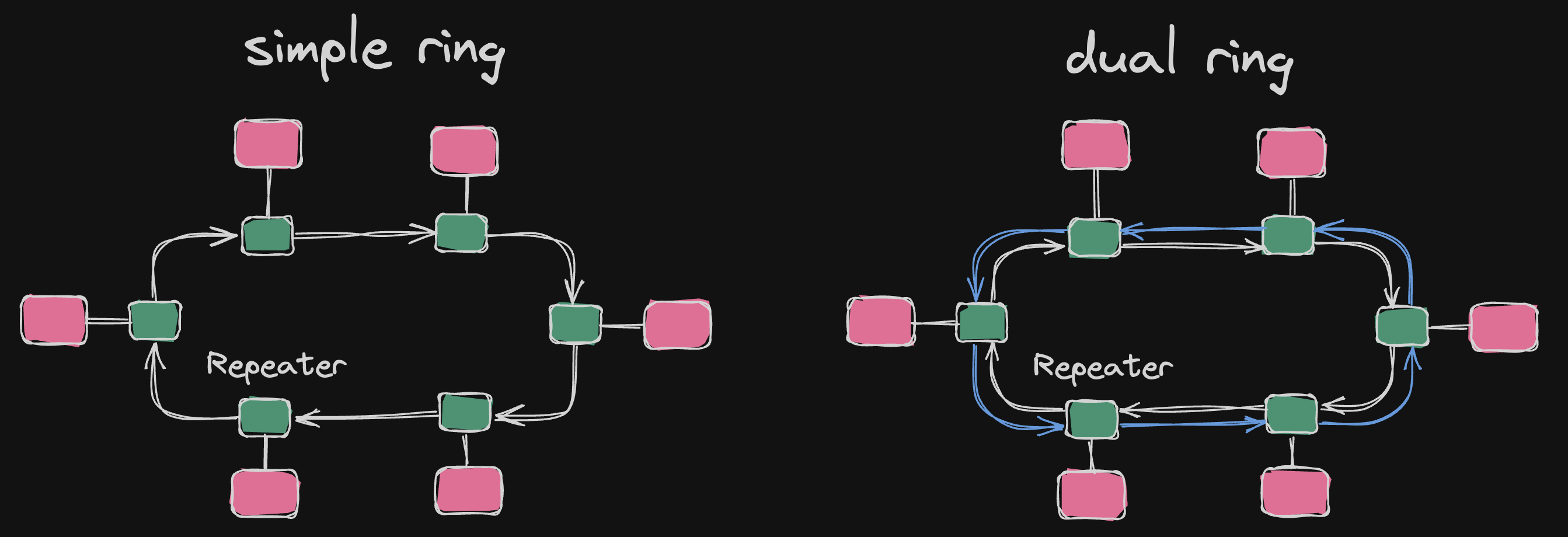 1. a simple ring에서 하나의 고장은 전체 네트워크를 다운시킨다.