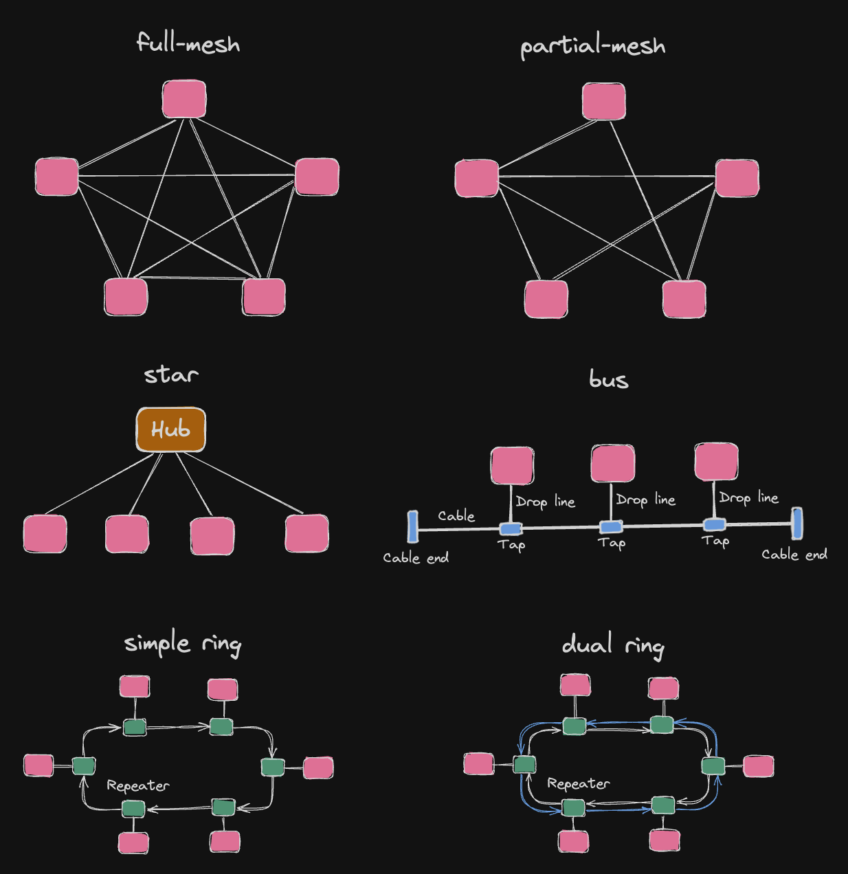 `Physical topology`: 물리적으로 네트워크가 깔린(laid out) 방식