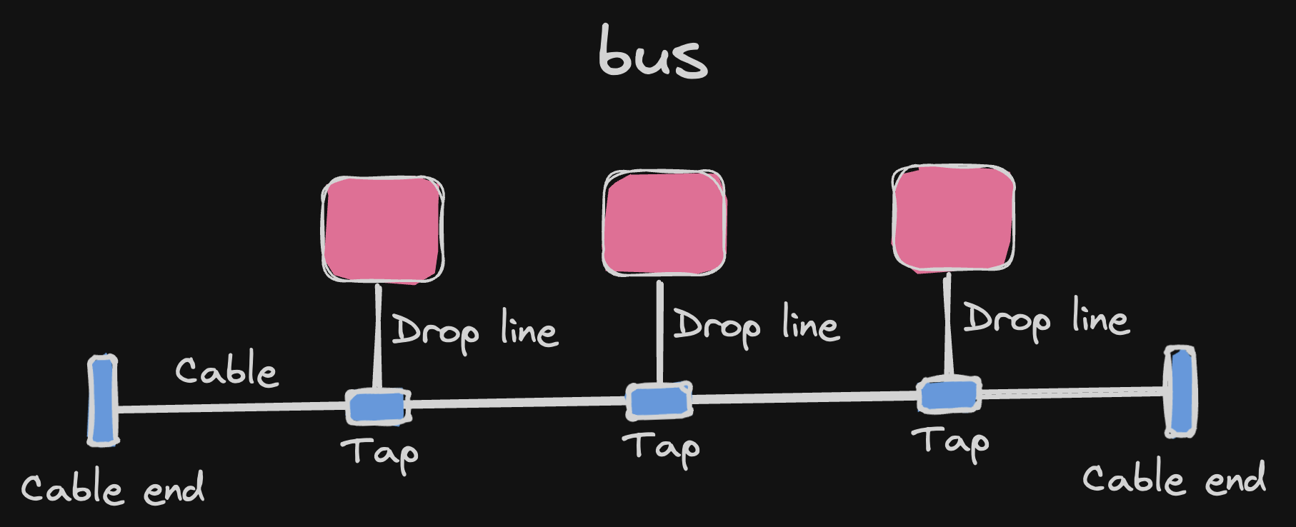 a `bus` topology: 하나의 긴 메인 케이블에 모든 기기가 `multipoint`로 연결된 네트워크 형태.