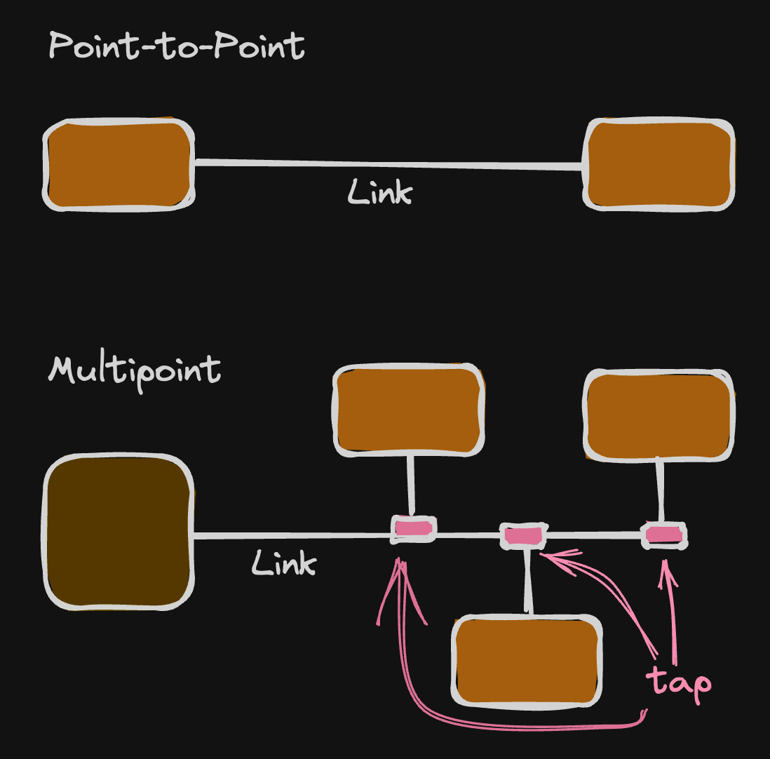a `Point-to-Point` connection: 두 장치만 연결하는 링크의 연결 방식.(링크에 연결된 포인트가 두 개뿐)