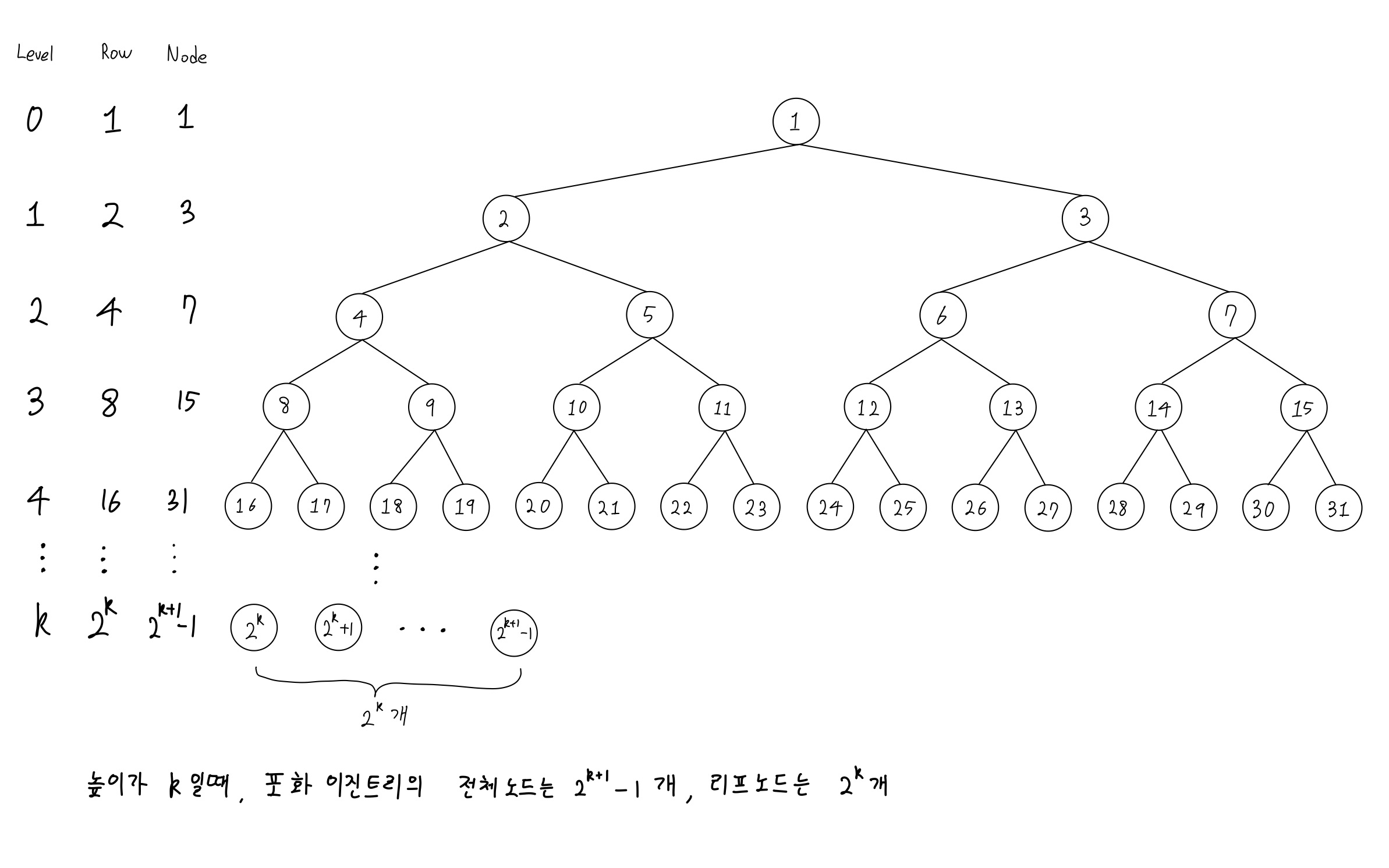 높이가 `k`인 포화 이진 트리는 총 `2k+1 - 1`개의 노드를 가지며 이때 리프 노드는 `2k`개다.