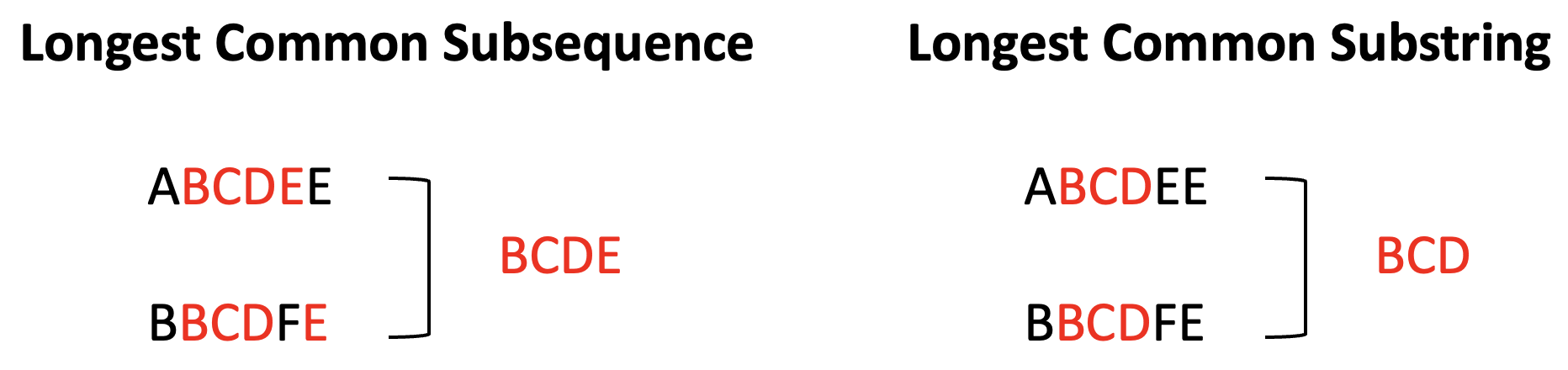 `최장 공통 부분 수열`은 [백준 - 11053] 가장 긴 증가하는 부분 수열문제처럼 부분 수열을 찾는 문제이고 `최장 공통 문자열`은 연속되는 문자열을 찾는 문제로 최대 공약수와 비슷하다.