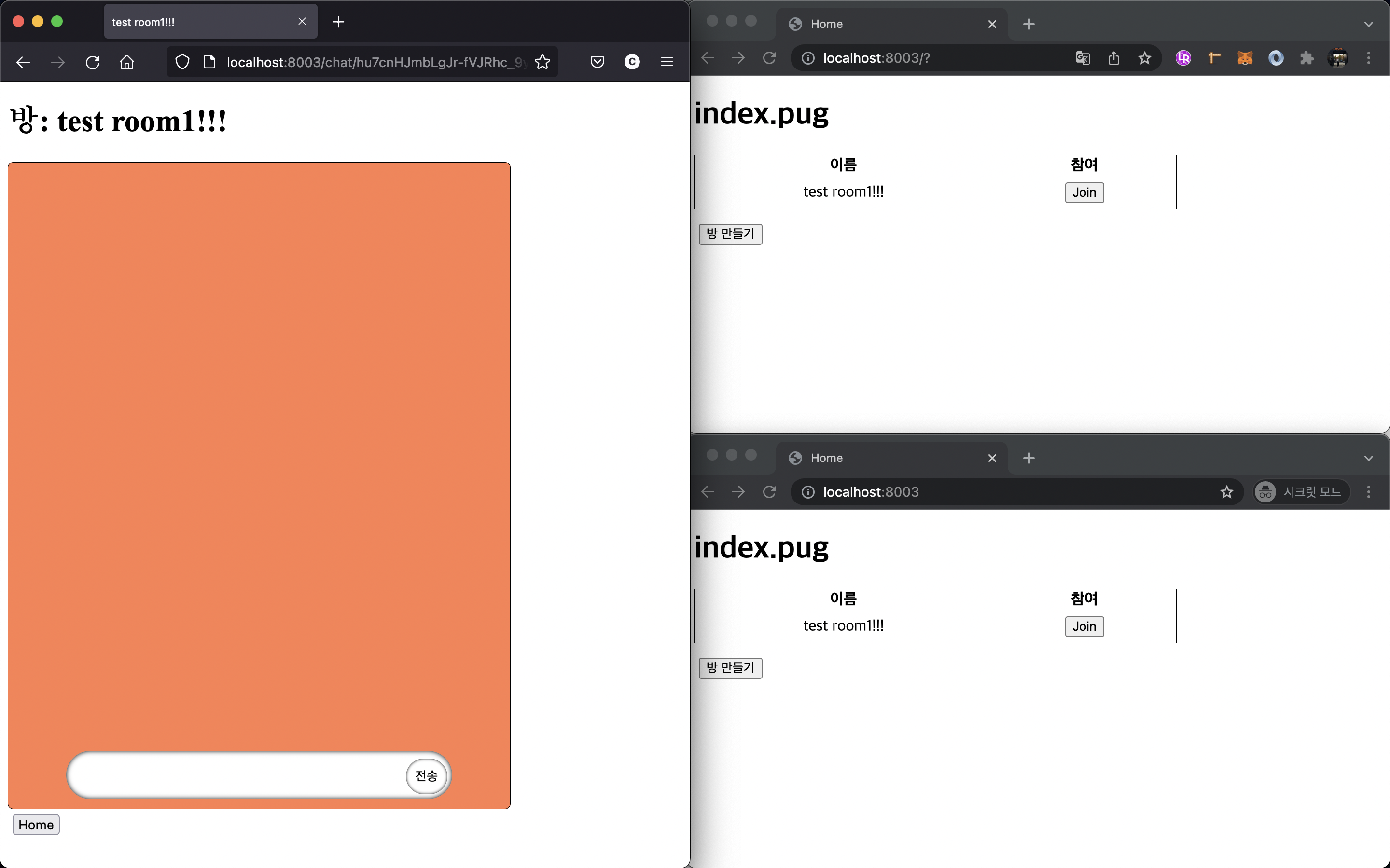 파이어폭스, 크롬으로 보통 창과 시크릿 창을 열어 총 4명의 client로 테스트해보았습니다.