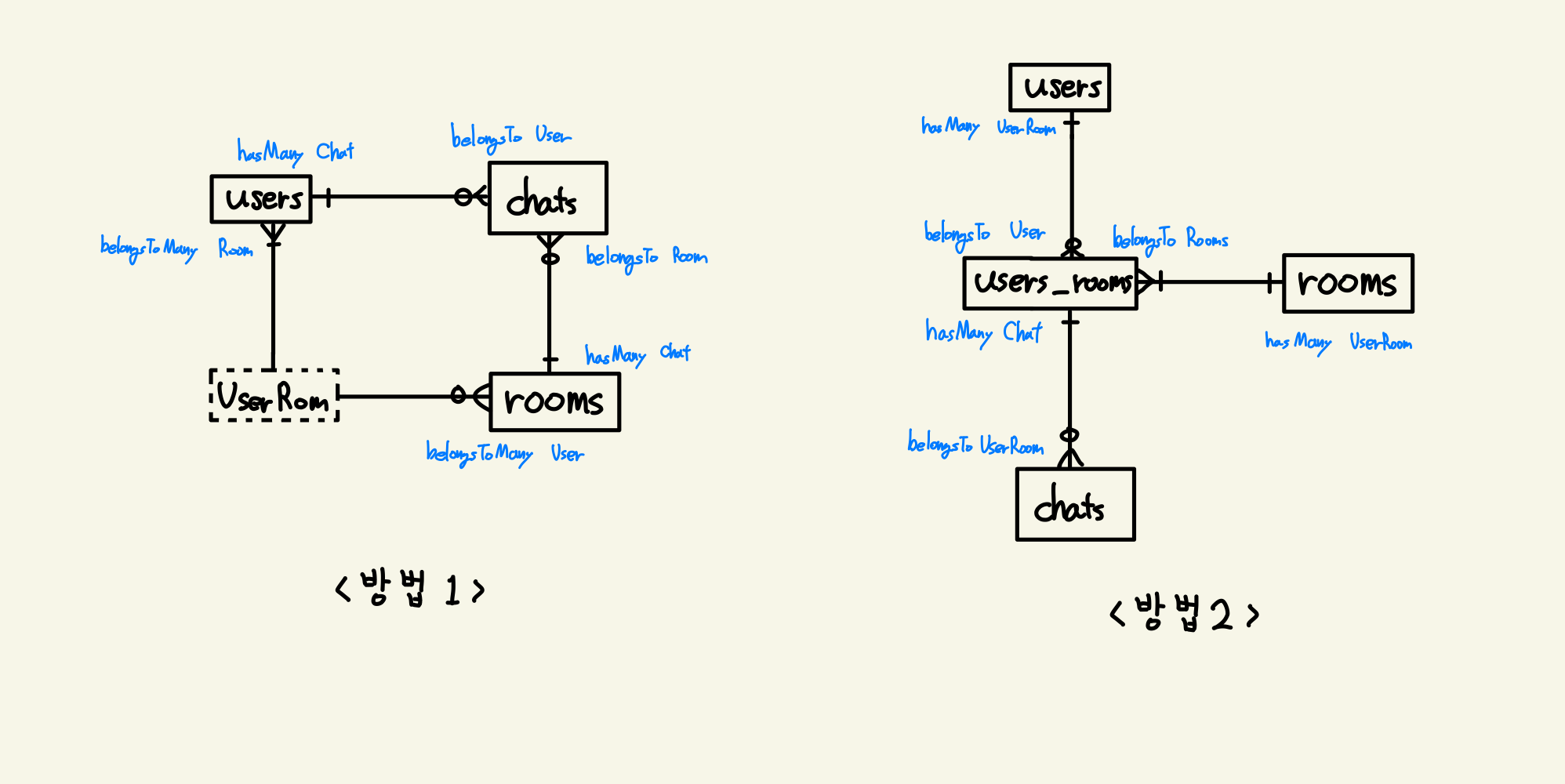 '메시지를 어디에 연결할까?' 가장 큰 고민이었습니다. 가장 처음 든 생각은 <방법 1>입니다. 하지만 <방법 1>은 chats에서 한 명이 같은 방에 채팅을 보낼 때마다 userId와 roomId를 중복해서 담은 데이터가 chats 테이블에 쌓이게 됩니다. 또 chats와 users_rooms테이블에 데이터가 중복됩니다. 그래서 <방법 2>를 생각했습니다. uesrs와 rooms의 다대다 관계를 이어주는 users_rooms테이블에 chats를 연결해 데이터 중복을 줄였습니다.