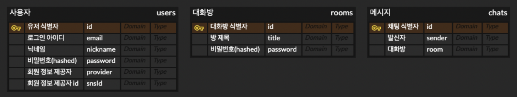 모든 테이블에 createdAt, updateAt, deletedAt을 추가 해 시간을 이용해 대화방에서 나갔다가 다시 접속했을 때 나가기 전 메시지를 불러오지 않을 계획입니다. 대충 컬럼을 생각해봤으니 관계를 맺고 정규화를 통해 나은 방법을 찾아보겠습니다.