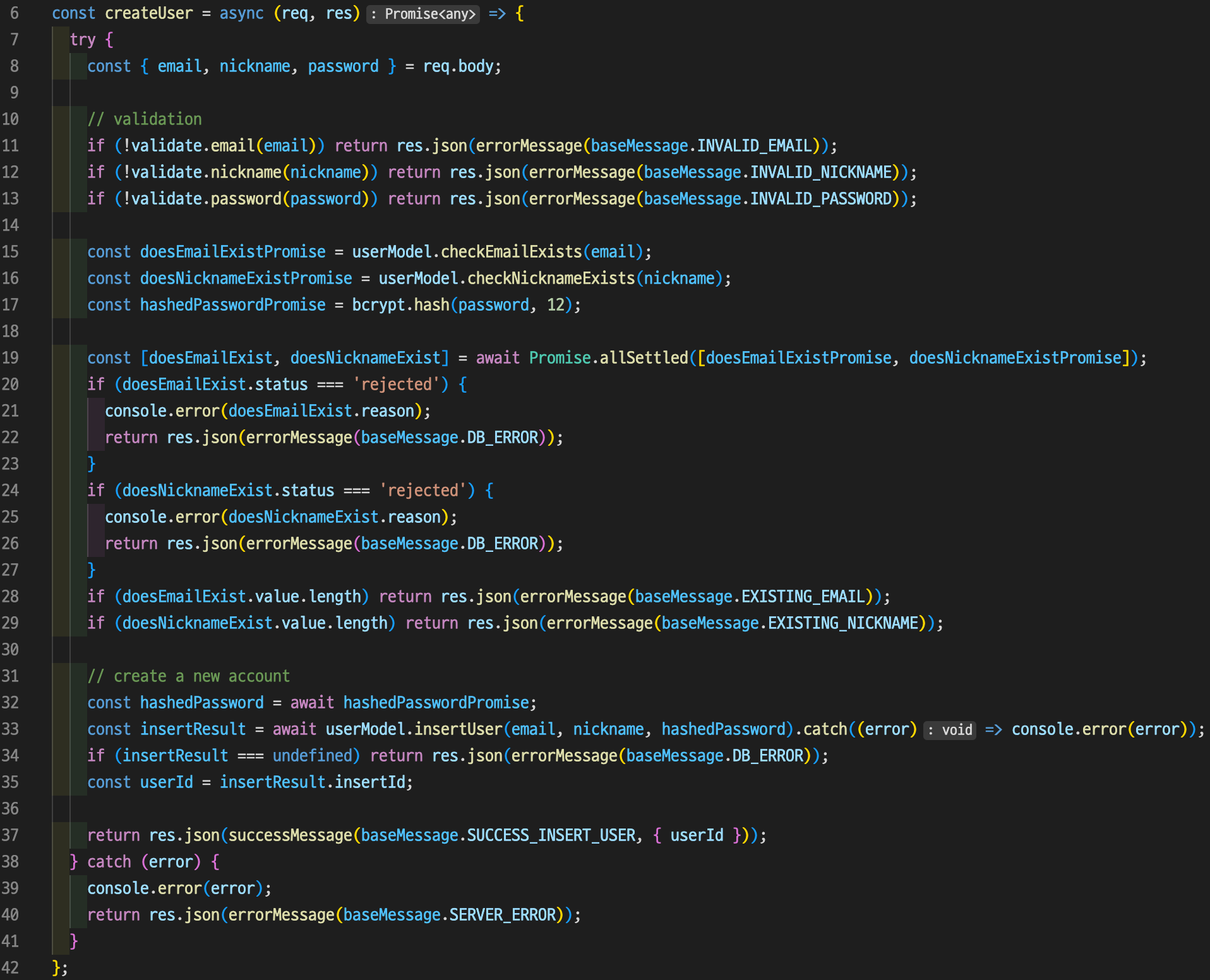 이 과정에서 이메일, 닉네임 중복확인, 비밀번호 해쉬화, 새 유저 생성은 비동기 작업으로 이루어진다. 첫 번째 고민은 비동기처리를 하나하나 순서대로 await await await으로 받아 동기와 다름없이 처리하고 싶지 않았다. 먼저 비동기 작업을 모두 프로미스로 받은 후 나중에 한 번에 await으로 받고 싶었다. 처음 생각한 방법은 이메일, 닉네임 둘 중 하나라도 중복되면 안 되기에 Promise.all을 썼다. Promise.all은 promise 리스트를 인자로 받고 하나라도 reject 되면 모든 promise를 무시하고 catch에 잡힌다.