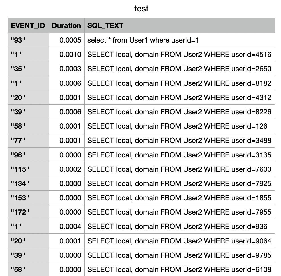 `SELECT EVENT_ID, TRUNCATE(TIMER_WAIT/1000000000000,6) as Duration, SQL_TEXT