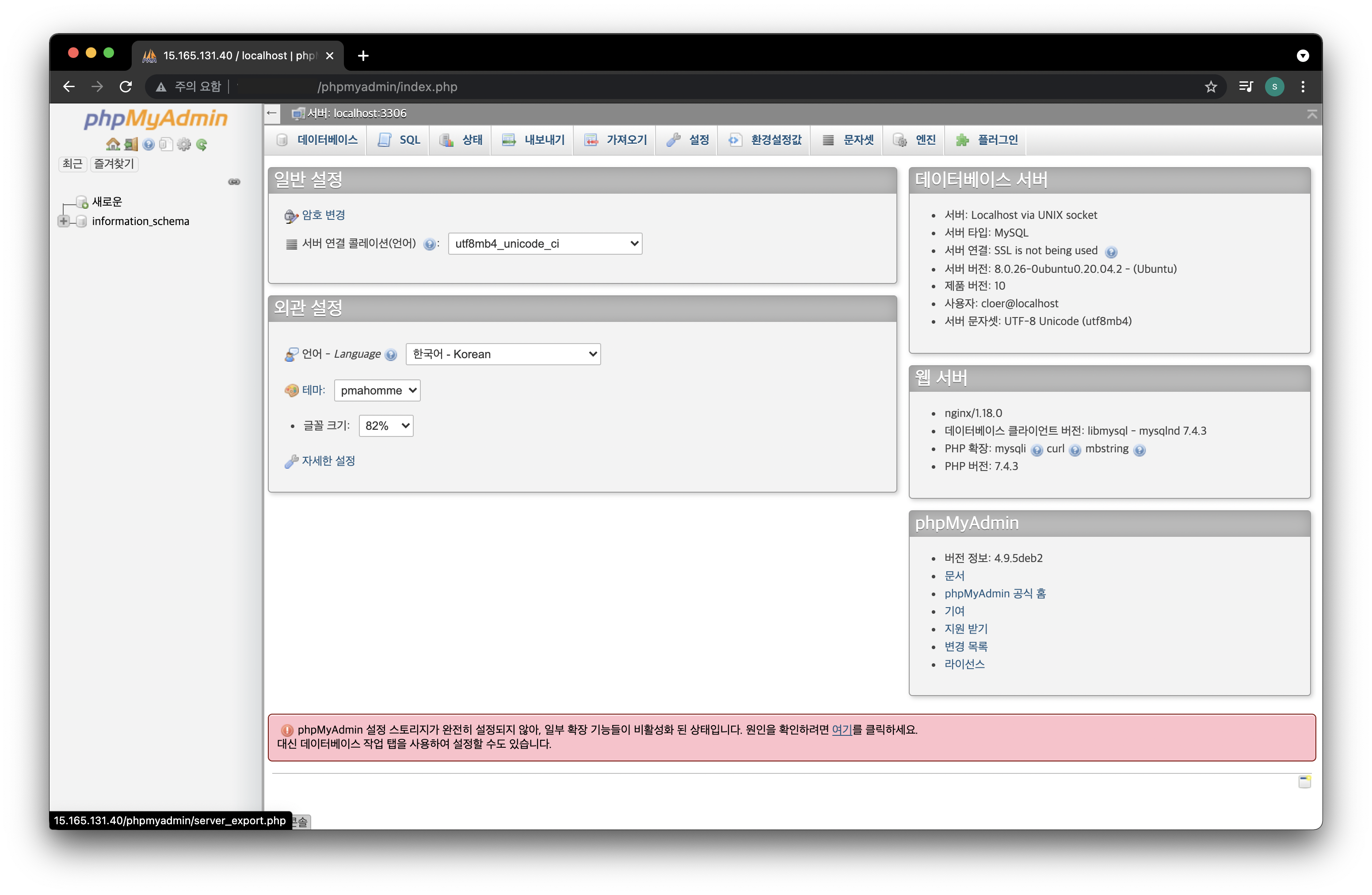 AWS ip/myadmin으로 확인한다. (앞서 만들었던 ss_db를 삭제했어서 위 phpmyadmin 페이지에 표시되지 않습니다.)