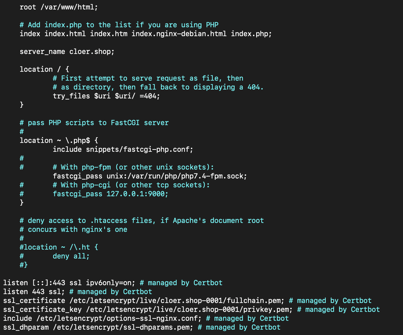 ip주소, www.cloer.shop으로 접근했을때 https로 redirection해주고 서브도메인에서도 80번 포트로 접근하면 https로 돌려줬다. certbot에서 작성해준 스크립트는 같은 내용인거같아서 주석처리 했다.