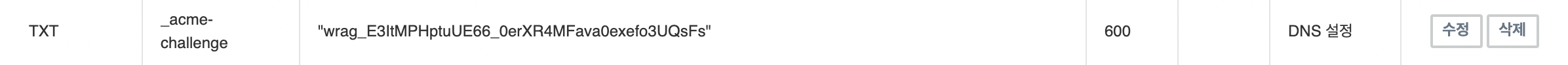 수동설치를 하면 이런식으로 텍스트를 주는데 저 텍스트를 도메인의 레코드에 추가해 도메인에서 한 요청임을 인증해야한다. 저 화면이 뜨면 바로 엔터를 치지 말고 해탕 텍스트를 레코드에 추가하고 업데이트를 기다렸다가 엔터를 치자.