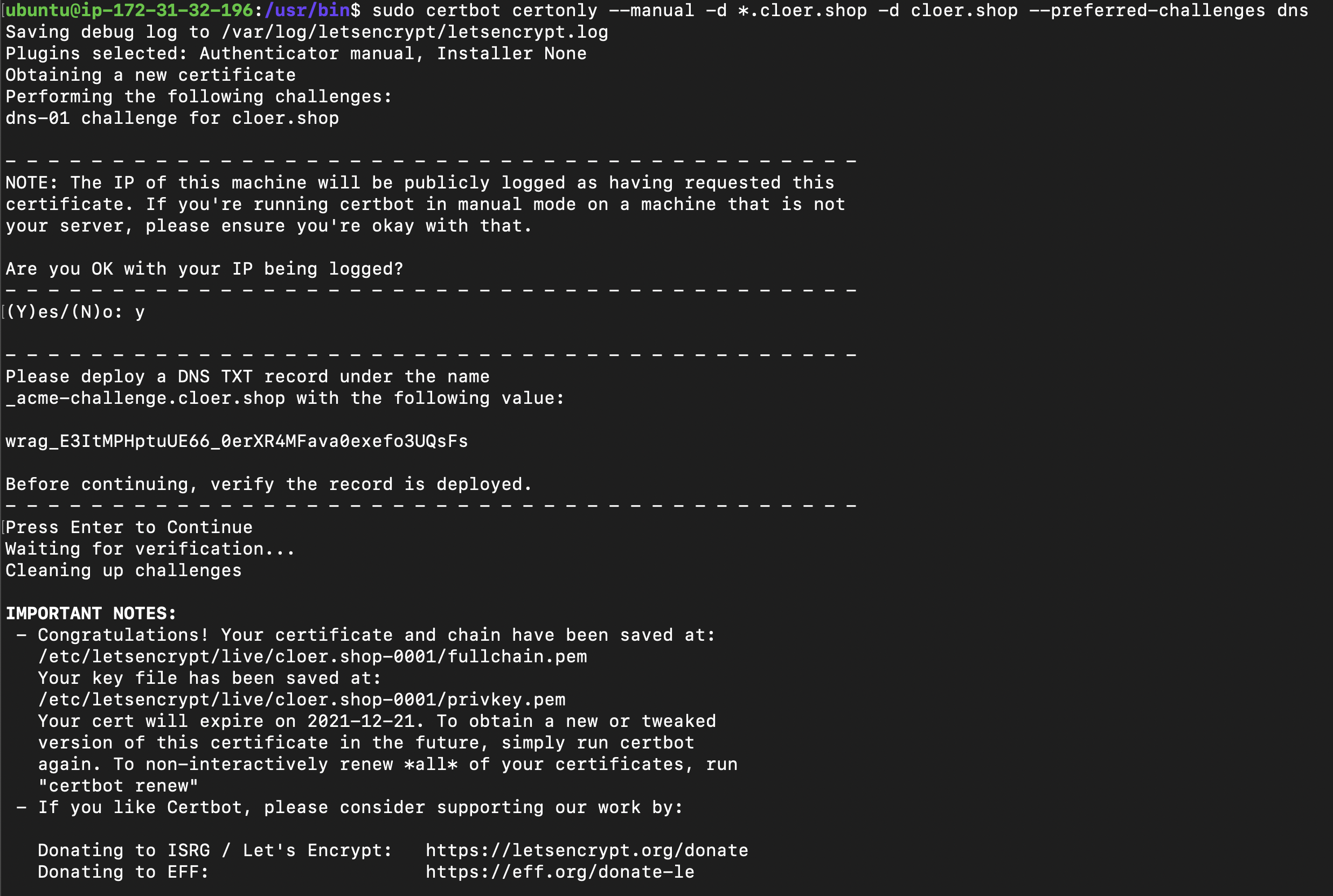 sudo certbot certonly --manual -d *.cloer.shop -d cloer.shop --preferred-challenges dns