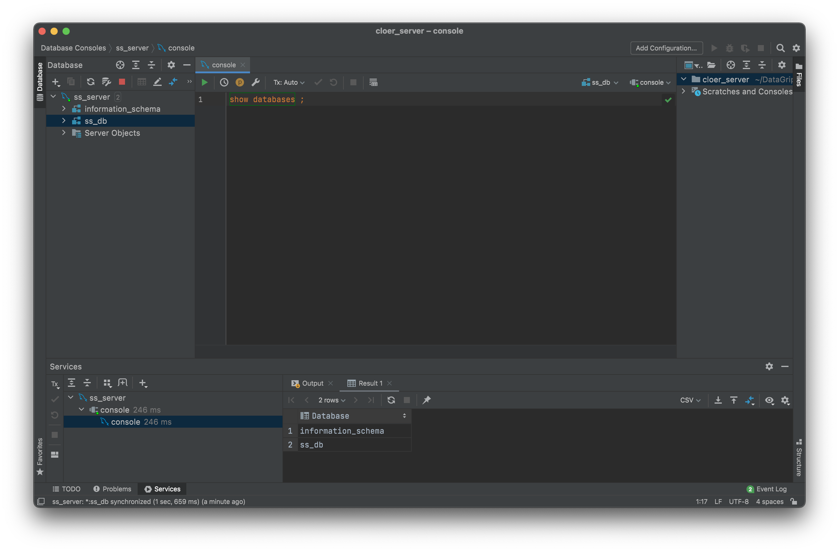 mysql> grant all privileges on ss_db.* to 'cloer'@'%'; //권한 부여