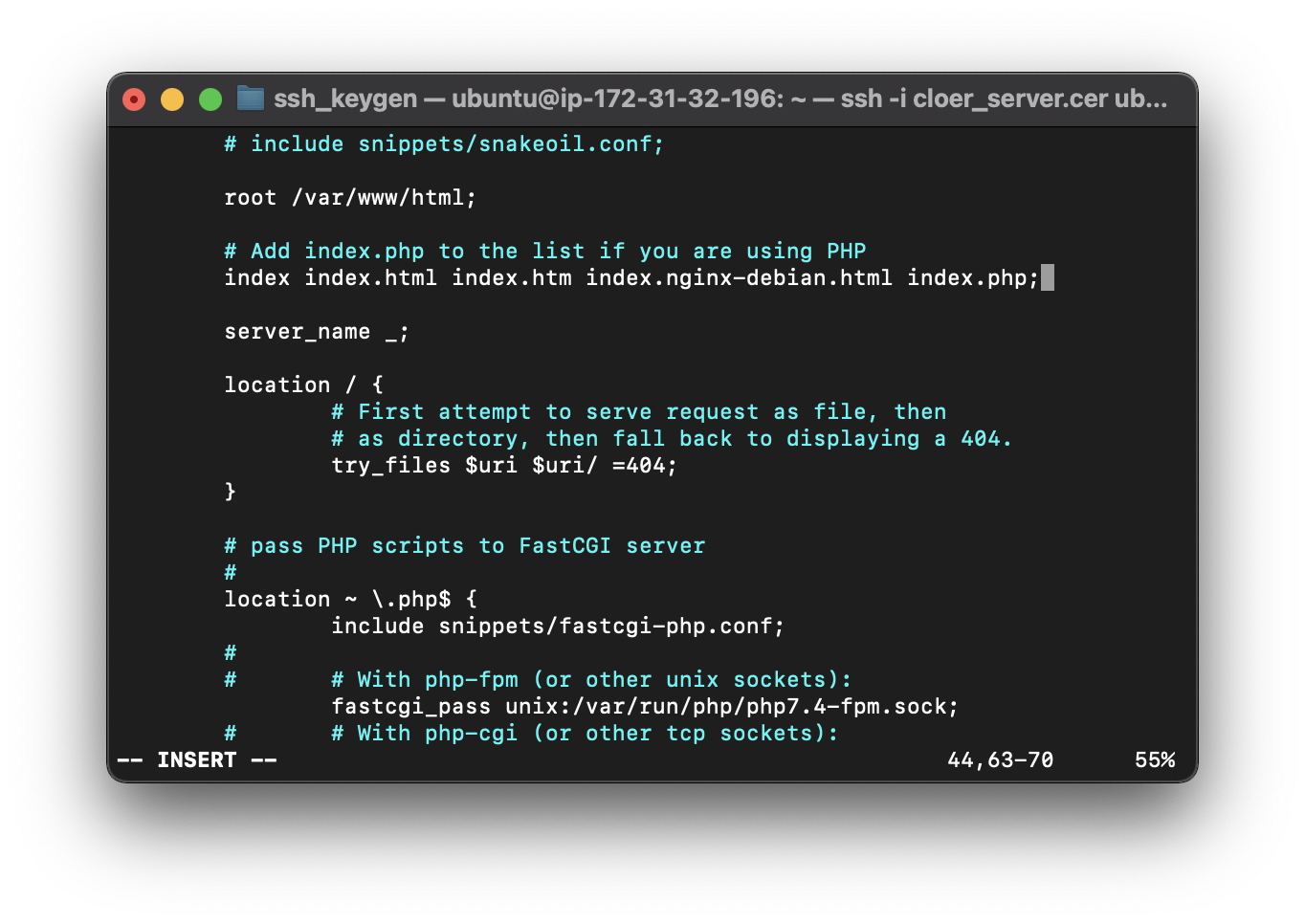 /etc/nginx/sites-available/default 파일에 index.php파일을 추가해준다.