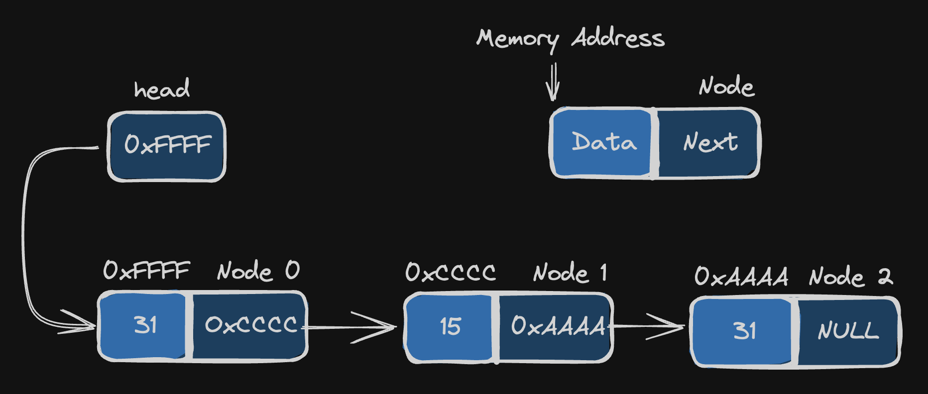 위 그림은 단일 연결 리스트를 간단하게 표현한 그림입니다. 노드에는 값과 다음 노드의 주소가 저장되며 저장된 주소를 타고 모든 노드를 탐색할 수 있습니다. 그렇다 보니 2번 노드에 가기 위해서는 1번 노드를 거쳐야 하고 1번 노드에 가기 위해서는 0번 노드를 거쳐합니다. 즉 단방향 `순차접근(sequential access)`만 가능합니다.(이중 연결 리스트에서는 양방향으로 가능합니다.)