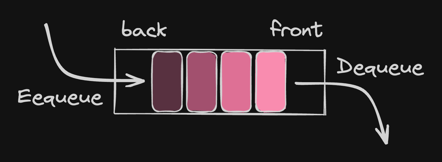 큐는 앞과 뒤가 있습니다. 줄을 생각해보면 당연합니다. 줄에는 줄에 들어오는 쪽이 있고 나가는 쪽이 있습니다. 우리는 줄에 들어오는 쪽을 뒤, 나가는 쪽을 앞이라고 부릅니다. 큐도 마찬가지입니다. 보통 큐에서 나가는 쪽을 front, head, start, first 등으로 부르고 큐에 들어오는 쪽을 back, tail, end, last, rear 등으로 부릅니다. 이 글에서는 front와 back으로 하겠습니다.